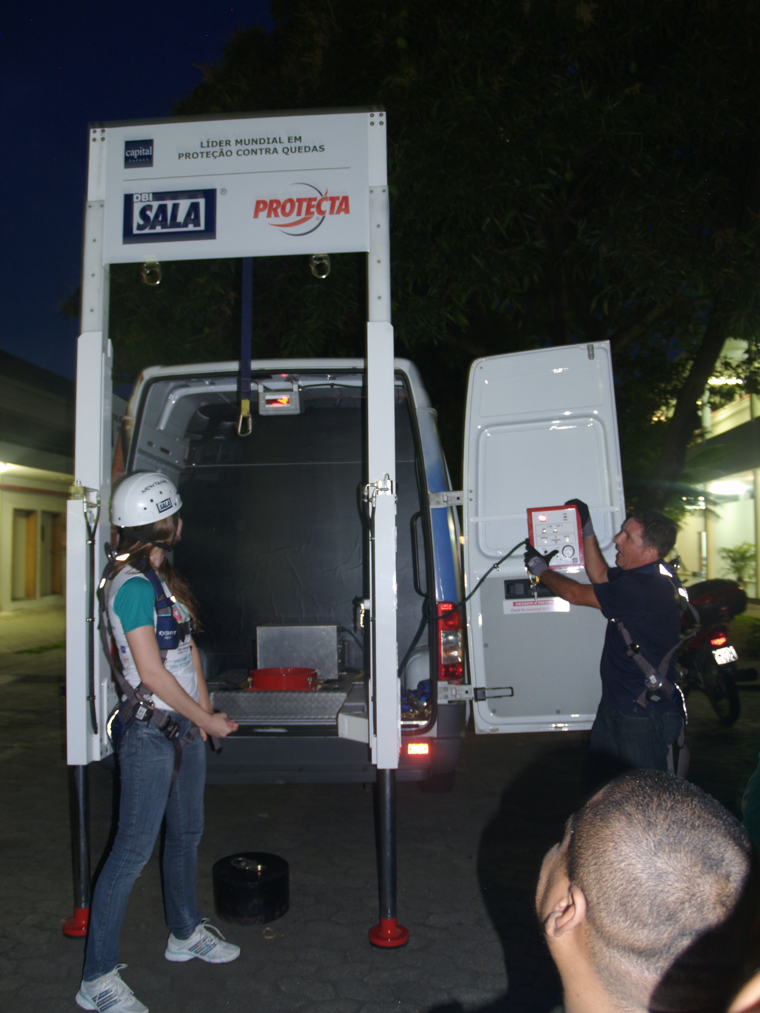 Ele ainda levou uma van especialmente preparada com um simulador de queda para mostrar, do lado de fora da sala de aula, a força e o impacto de quedas com diferentes dispositivos de segurança.