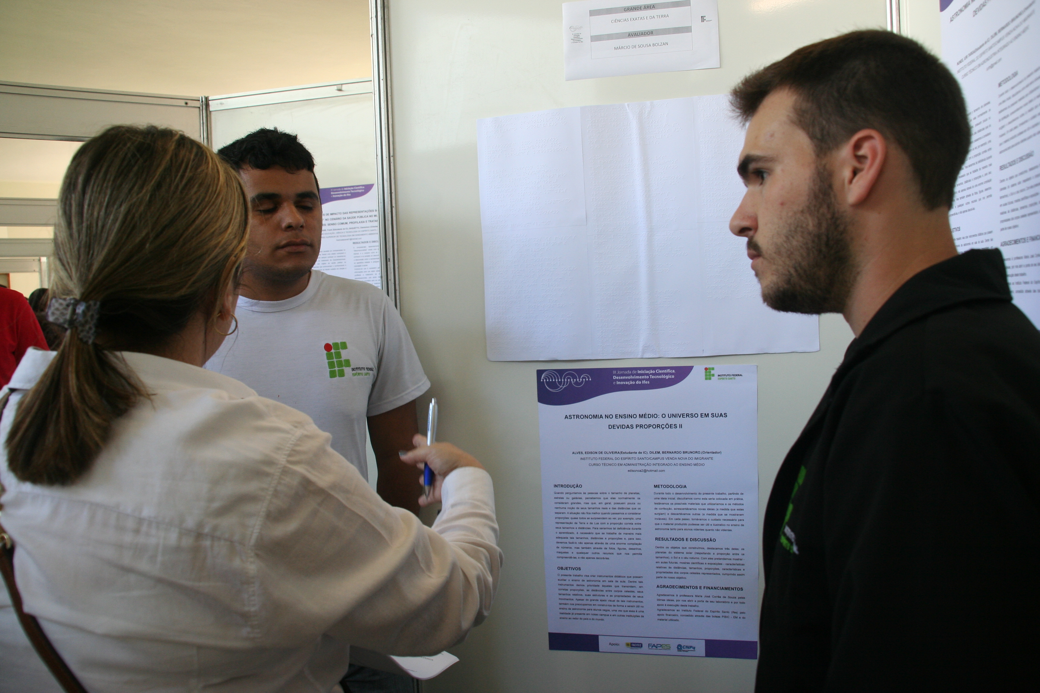 Segundo o professor, Edison, que é cego, fez o pôster para ele mesmo apresentar aos avaliadores durante a jornada e também para possibilitar que ouras pessoas com alguma deficiência visual pudessem ler. A pesquisa trata do ensino de astronomia e propõe a produção de objetos didáticos.