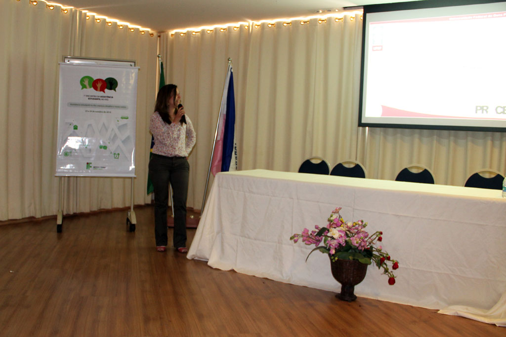 A tarde contou com a conferência “Assistência Estudantil: Processos Seletivos, Acompanhamento, Monitoramento e Avaliação das Ações”, com a presença da coordenadora de Assuntos Estudantis da Universidade Federal de Ouro Preto (Ufop), Camélia Vaz Penna. Camélia apresentou a estrutura da política de assistência da Ufop.