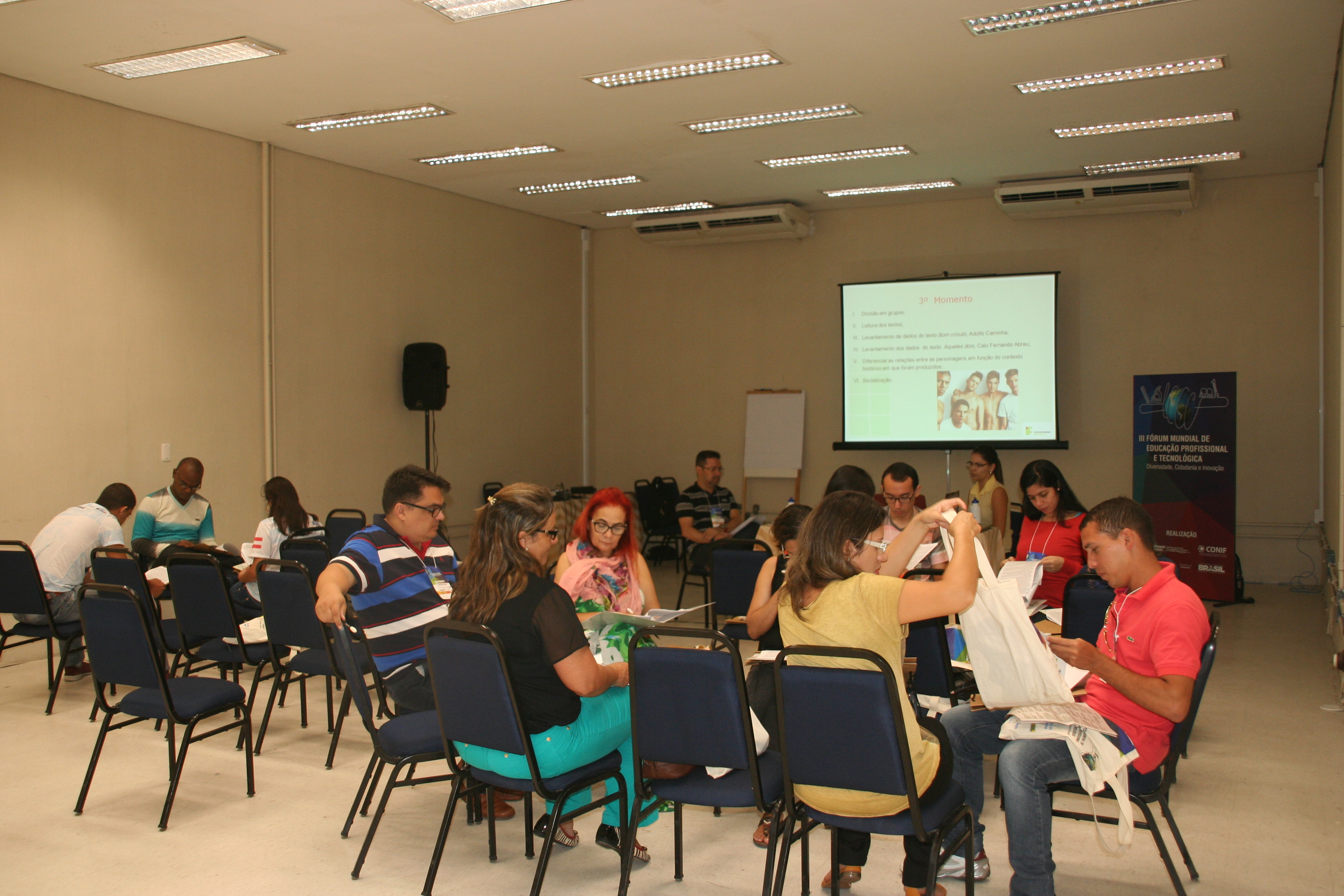 Na manhã da quinta-feira (28), os servidores Roberto Carlos Farias de Oliveira e Fernanda Souza da Silva do Campus Cachoeiro de Itapemirim, comandaram a oficina “Um olhar para a diversidade – oficina de produção literária” na sala Guaranhuns, com a participação de cerca de 15 pessoas. Os servidores apresentaram diversas produções literárias que trouxeram temas como machismo, preconceito, diversidade sexual e visões sobre a mulher. Esses temas foram amplamente discutidos e cada pessoa escreveu um texto – que poderia ser um conto, uma crônica, uma poesia ou um acróstico – sobre o tema. Em seguida as produções foram apresentadas para o grupo.