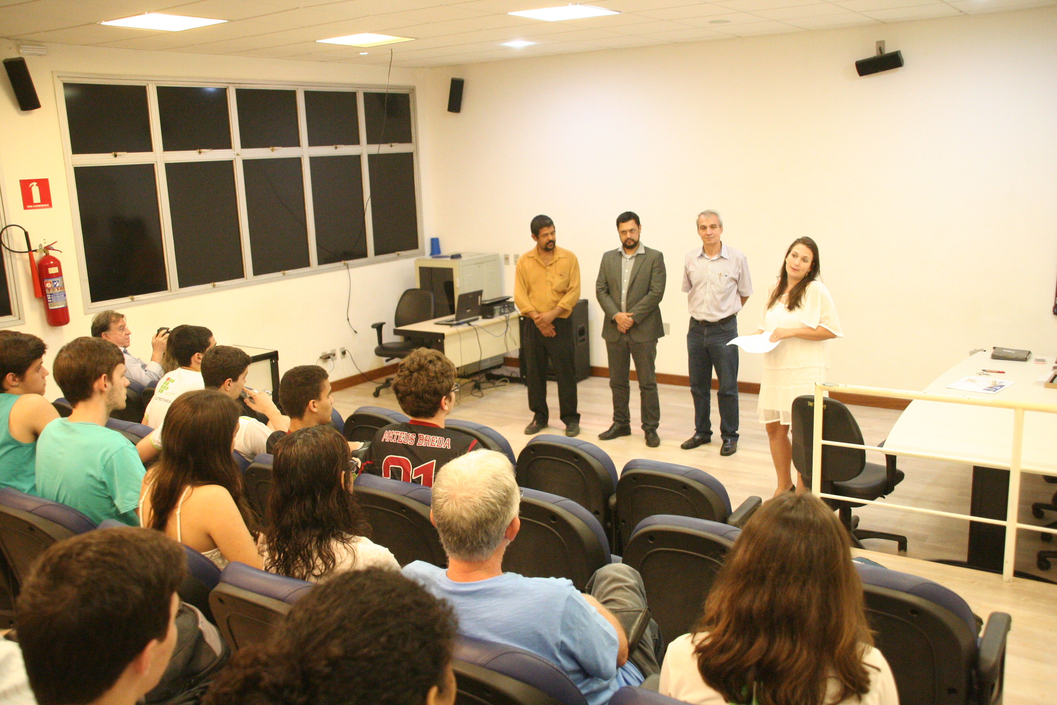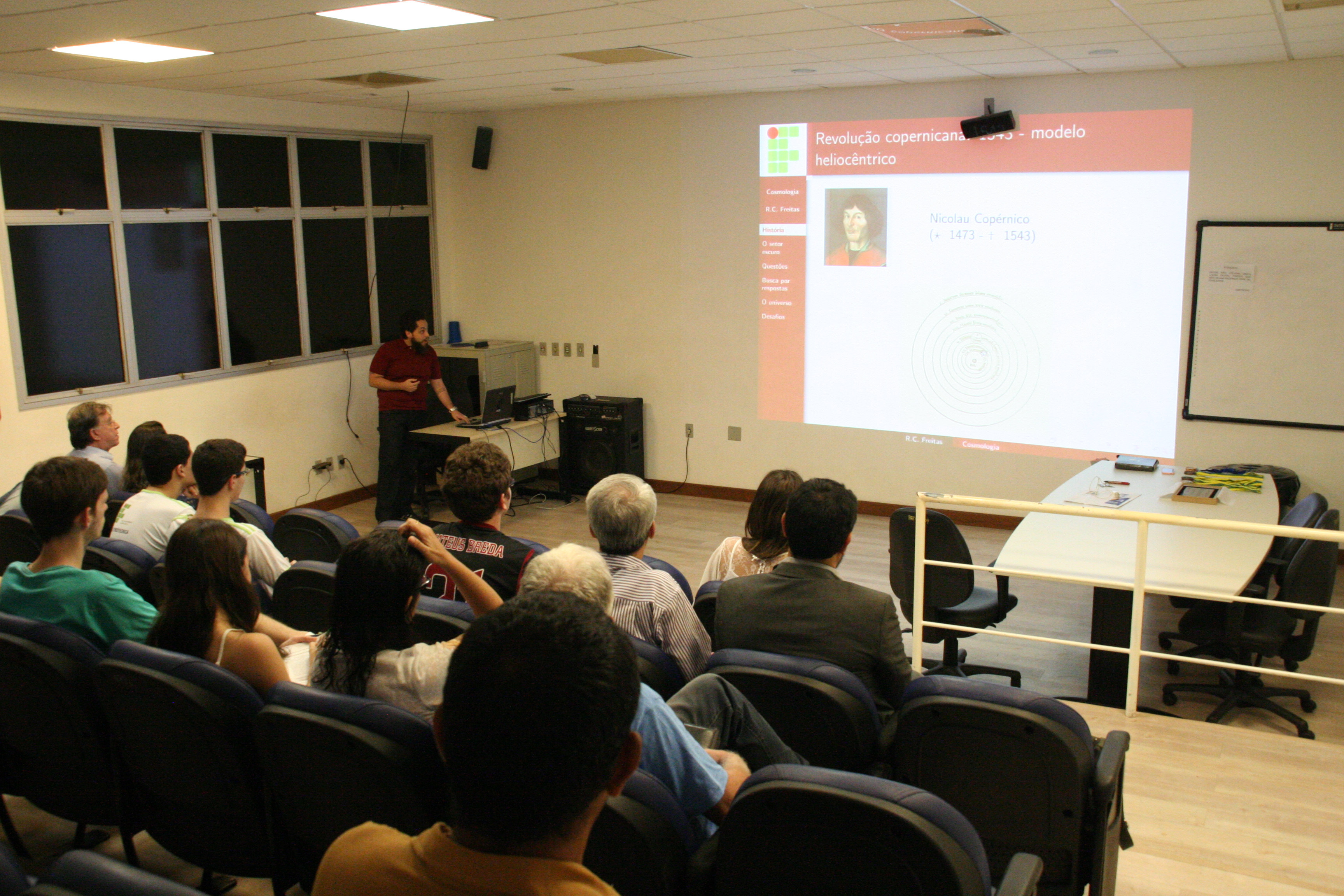 A cerimônia teve início às 18h15, com uma palestra do professor Rodolfo Camargo de Freitas. Ele falou sobre “Cosmologia: uma perspectiva histórica”, apresentando o histórico das teorias já elaboradas para explicar a origem e como funciona o universo. Em seguida, a professora Aline iniciou a entrega das medalhas, contando com a participação do diretor do Campus Vitória, Ricardo Paiva; do professor Gilmar Dias, coordenador da Física do campus; e do pró-reitor de Extensão do Ifes, Renato Tannure.