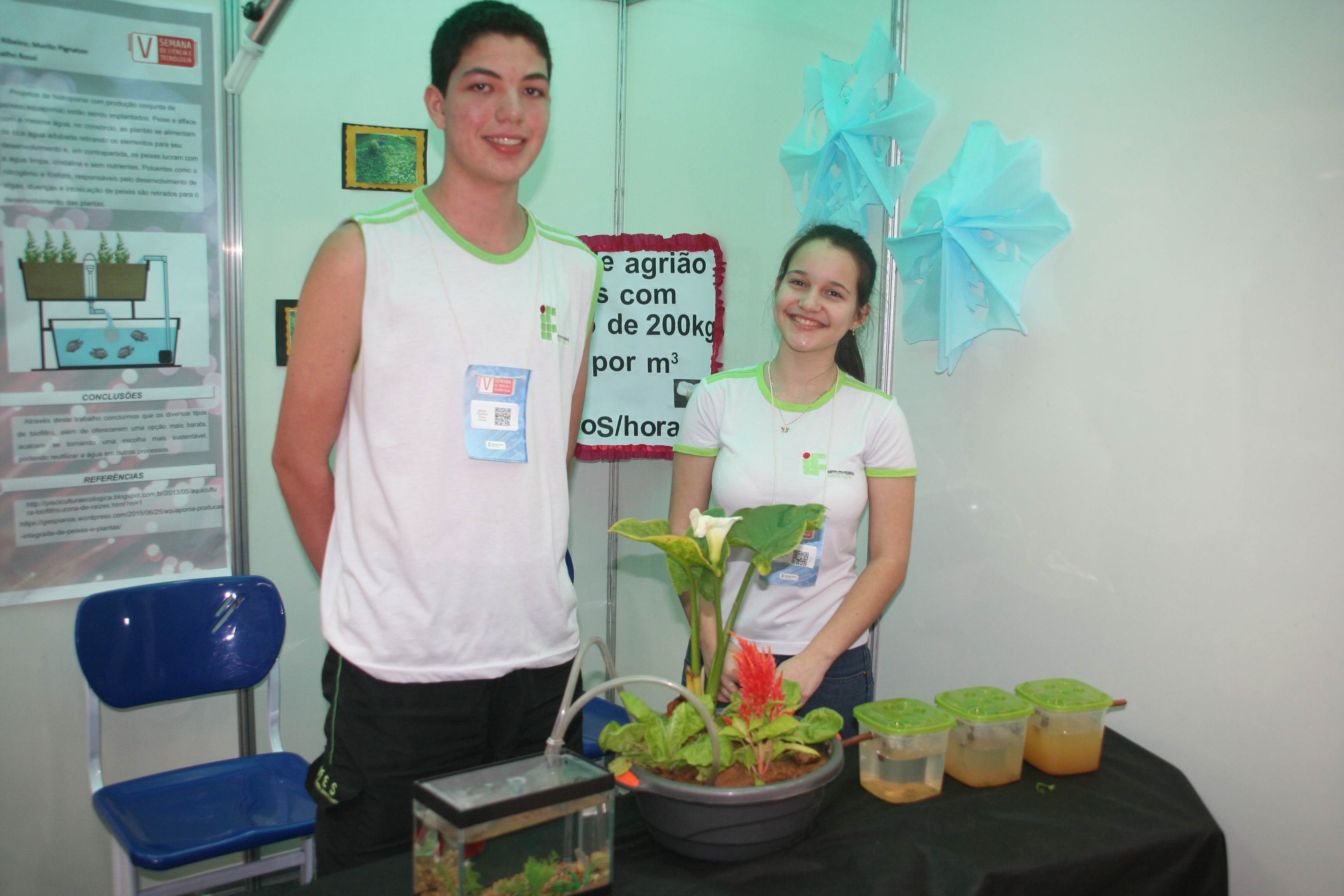 Já o projeto do Biofiltro, dos estudantes Murilo Pignaton e Brenda Siqueira da Silva, também do 2º ano do curso Técnico em Portos, pode ser utilizado por criadores de peixes. A proposta é uma bomba jogue a água com os dejetos dos peixes em plantações (de alface, por exemplo), e que outra bomba retorne com a água limpa para os pesqueiros. Além de irrigar, a água com dejetos é capaz de adubar o solo.