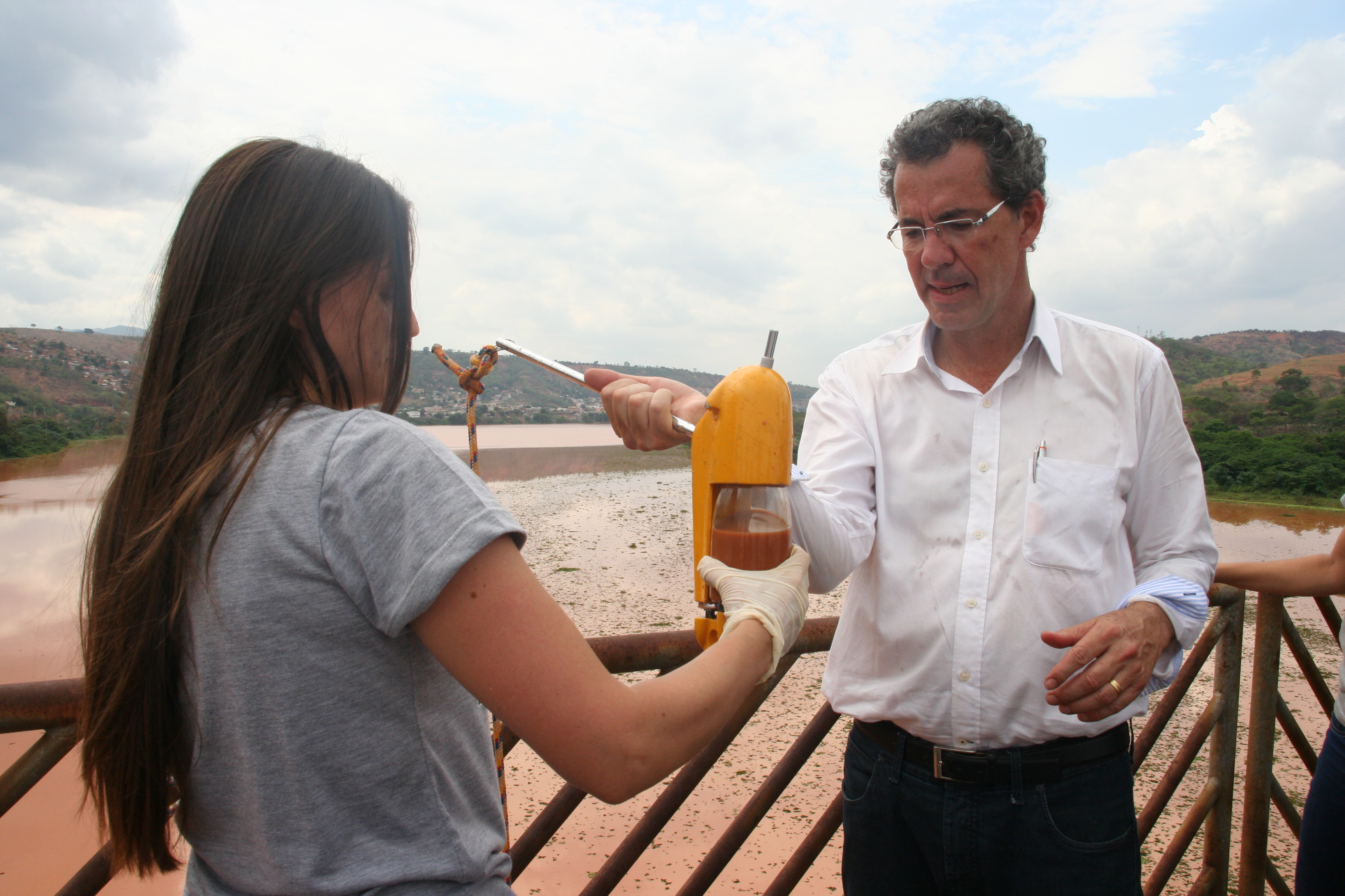 A informação passada pelo engenheiro ambiental Fernando de Souza era de que a “cabeça da lama” estava a cerca de 13 km acima daquele ponto, e já era possível notar uma mancha amarelada na água no reservatório. Fernando explicou aos alunos como funcionava o monitoramento e quais tipos de equipamentos eram usados.