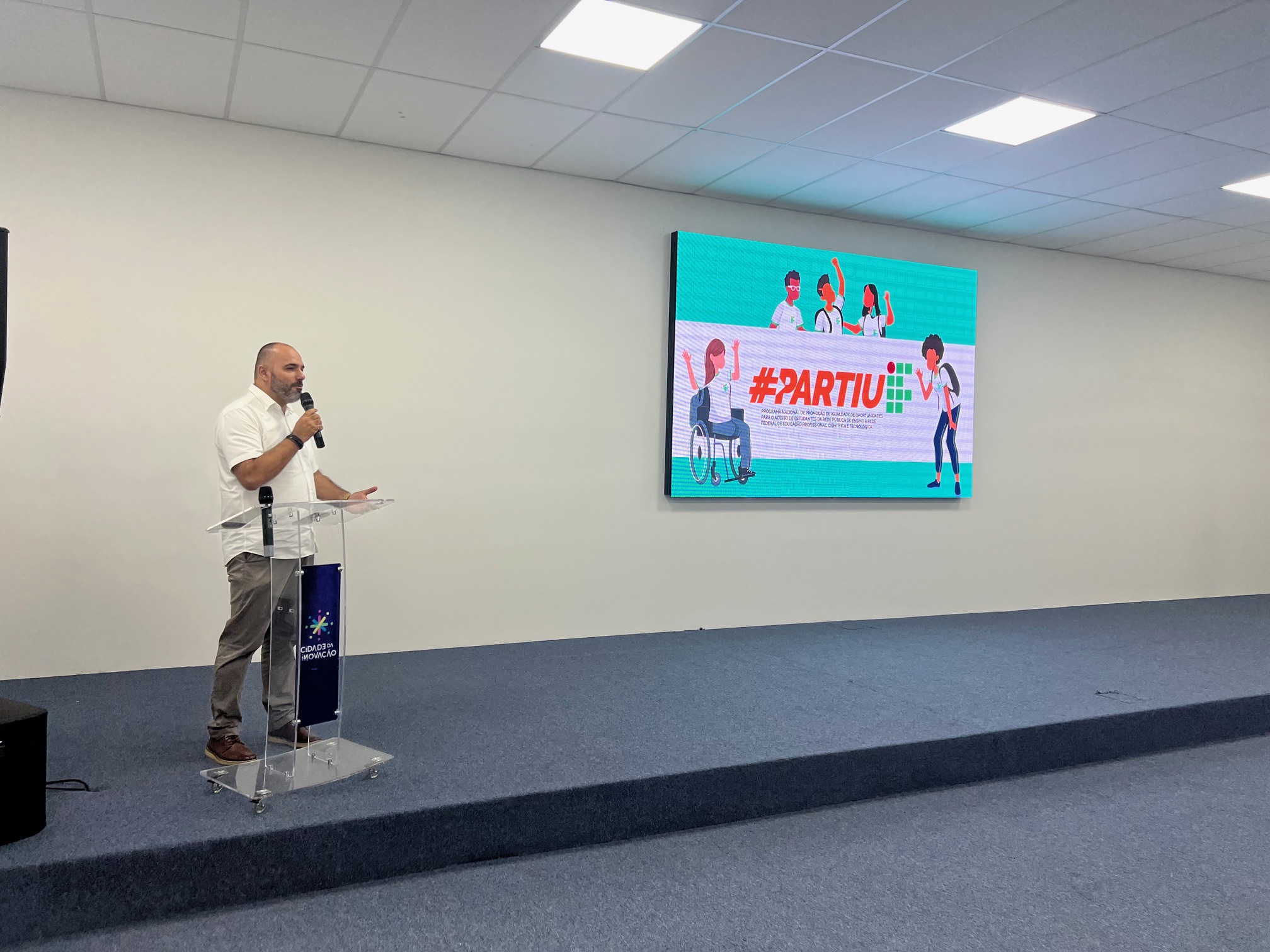 Gestores da área de educação, coordenadores locais e gestores do Ifes participaram, nesta quinta-feira (20), do lançamento do Partiu IF, realizado na Cidade da Inovação, em Jardim da Penha, Vitória. O Partiu IF é um programa do governo federal voltado para estudantes em vulnerabilidade social, negros, quilombolas, indígenas e pessoas com deficiência. Seu objetivo é oferecer reforço em português, matemática e ciências da natureza, de modo a ampliar a igualdade de oportunidades no acesso aos institutos federais.