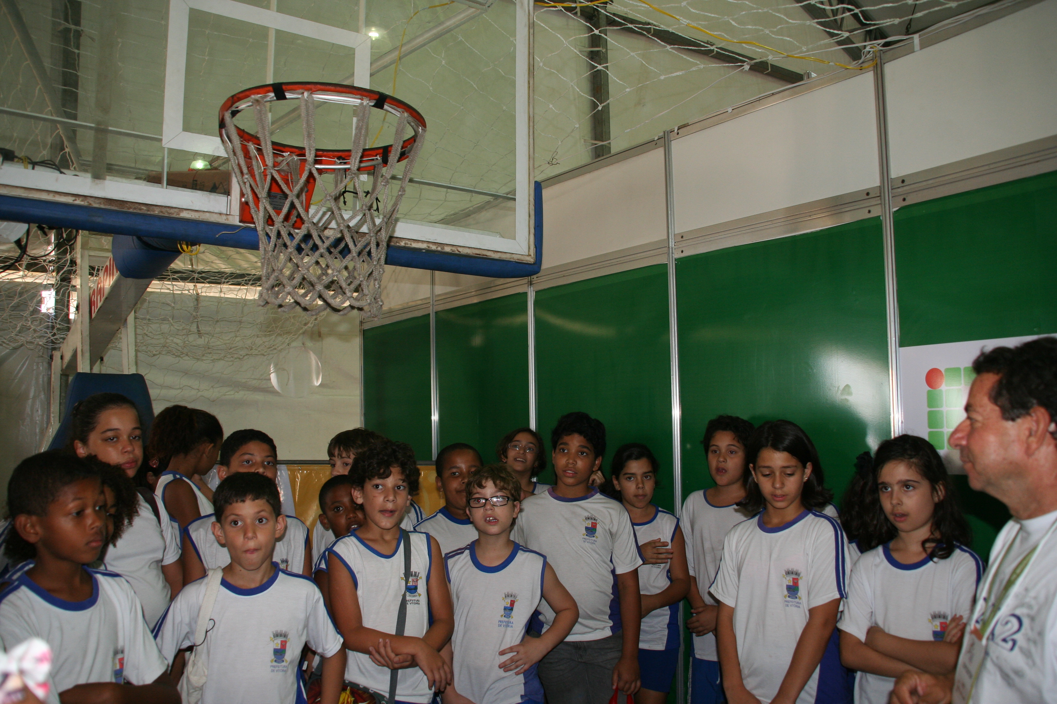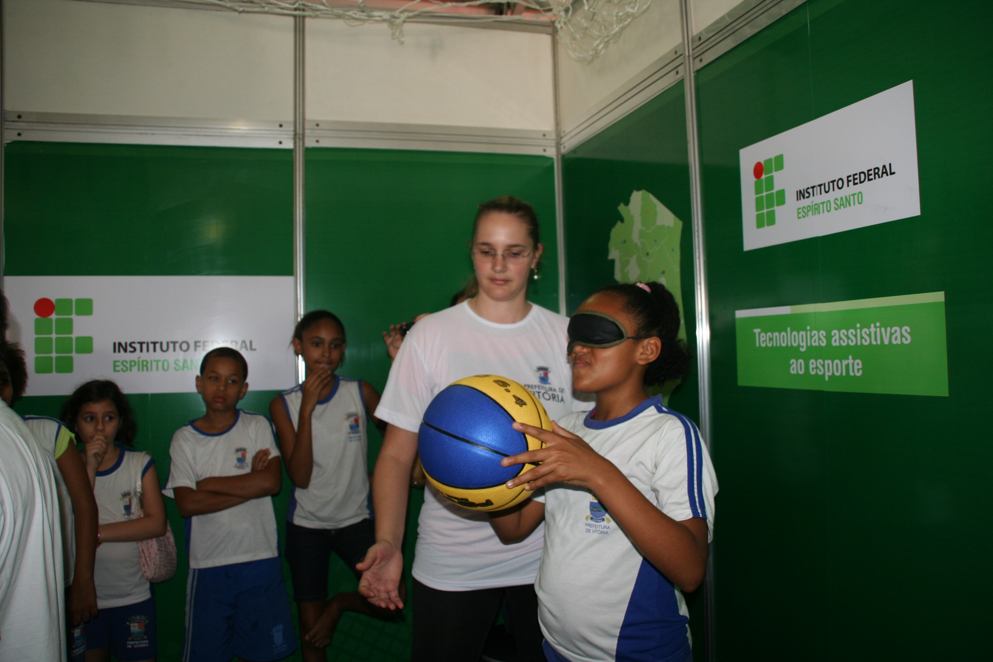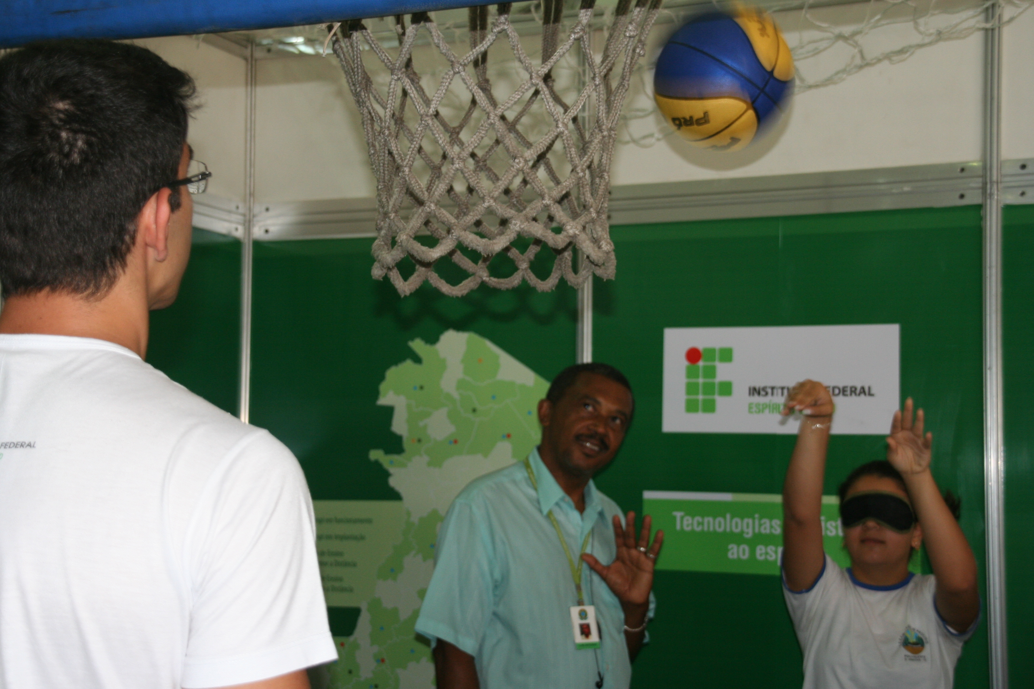 Mas o ponto mais movimentado do estande do Instituto foi o do projeto “Tecnologias Assistivas ao Esporte para Pessoas em Condição de Deficiência Visual”. No local, foi colocada uma cesta de basquete que emite sinais sonoros para orientar os arremessos dos visitantes. A pessoa que queria jogar era vendada, girava em torno de si e então tentava acertar a cesta. Quem acertasse três vezes levava uma medalha.