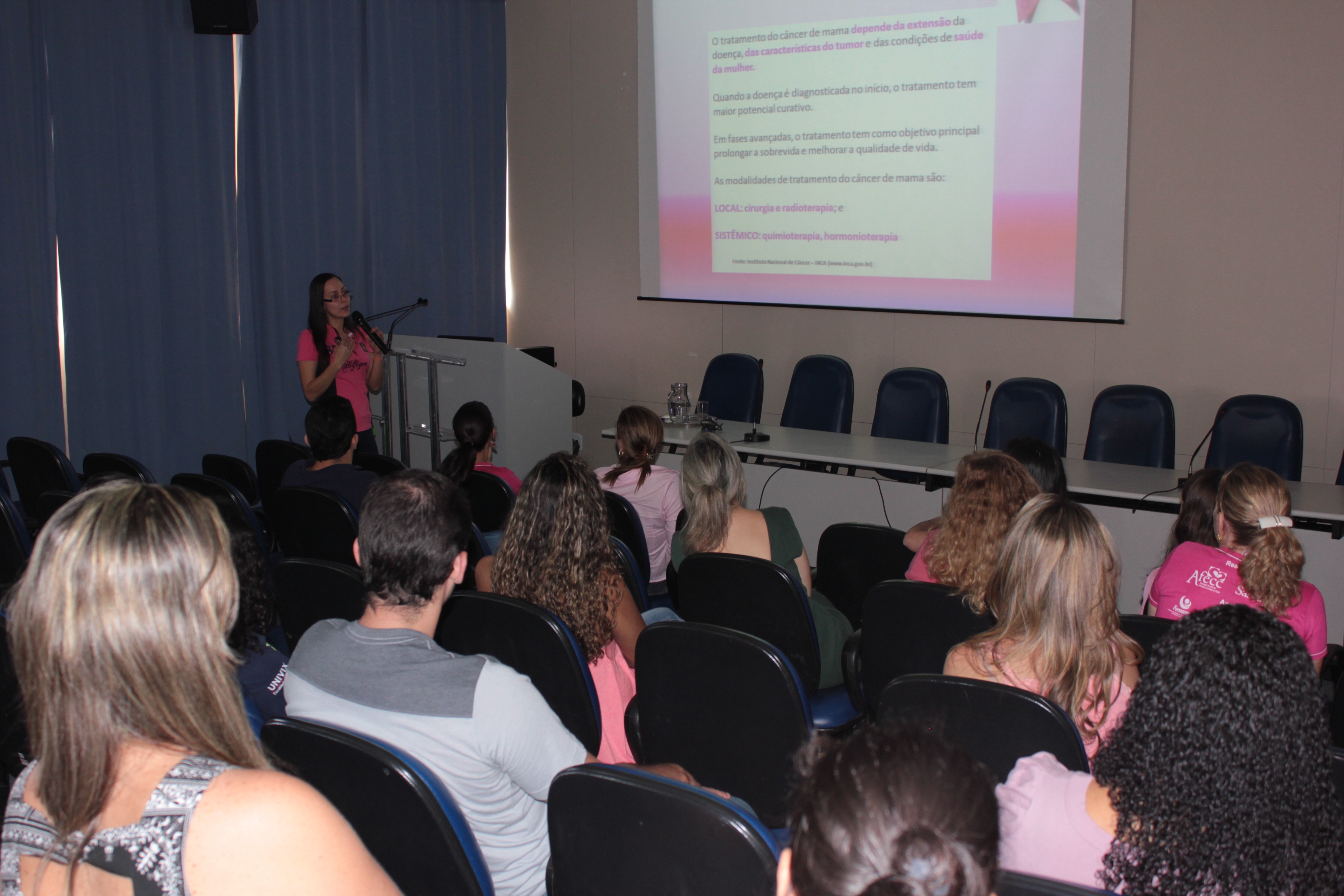 O campus Serra realizou, no dia 21, a palestra “Prevenção ao câncer de mama e colo de útero”, ministrada pela médica do trabalho da Coordenadoria de Atenção à Saúde do Servidor - CASS Adriana Vilarim Fernandes Fávaro. O evento foi realizado em apoio à campanha nacional Outubro Rosa, reunindo servidores do campus.
