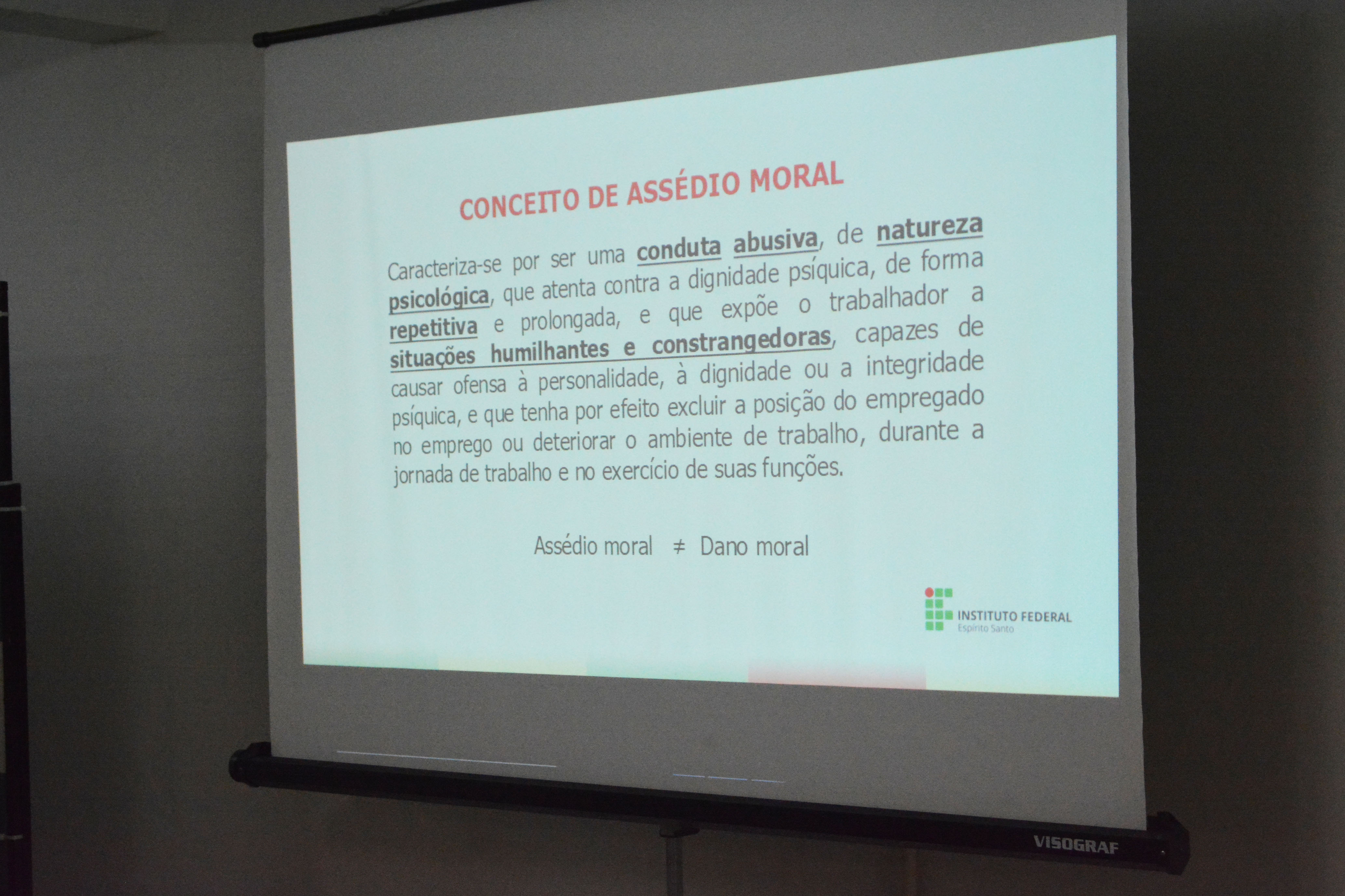 A assessora processual do Ifes, Layla Hatab, que realizou recentemente uma pesquisa sobre o assunto e analisa casos na sua prática diária na instituição, apresentou exemplos e fez alguns recortes sobre o assunto. “O assédio moral é o ato, não importa se a pessoa que sofreu se sentiu lesada ou não. O dano moral é a consequência, que a pessoa pode requerer indenização ou não, sempre judicialmente. O servidor público que presenciar deve denunciar os casos, e a instituição tem a obrigação de apurar, abrir processos administrativos e punir, caso seja necessário”, esclareceu.