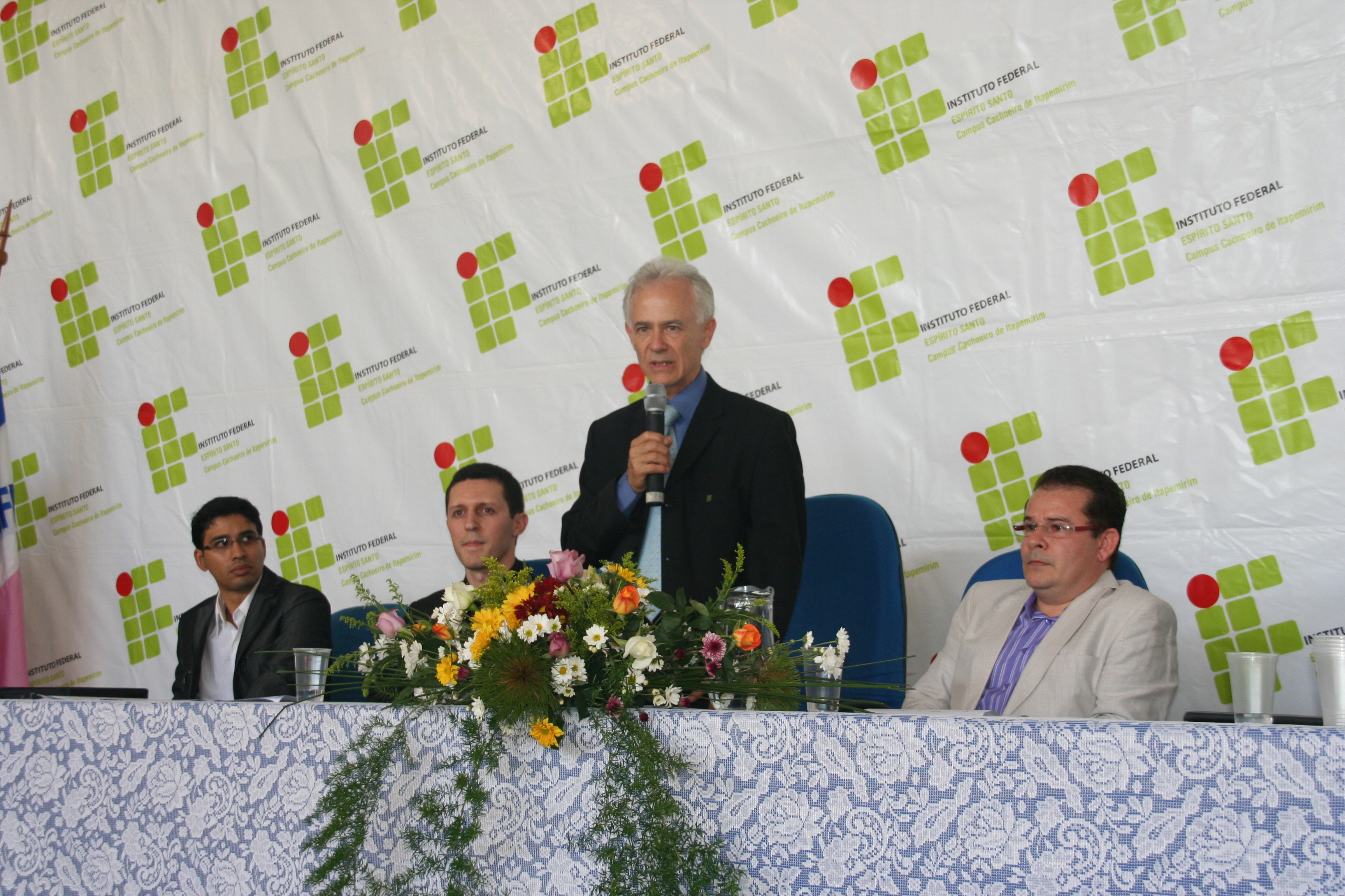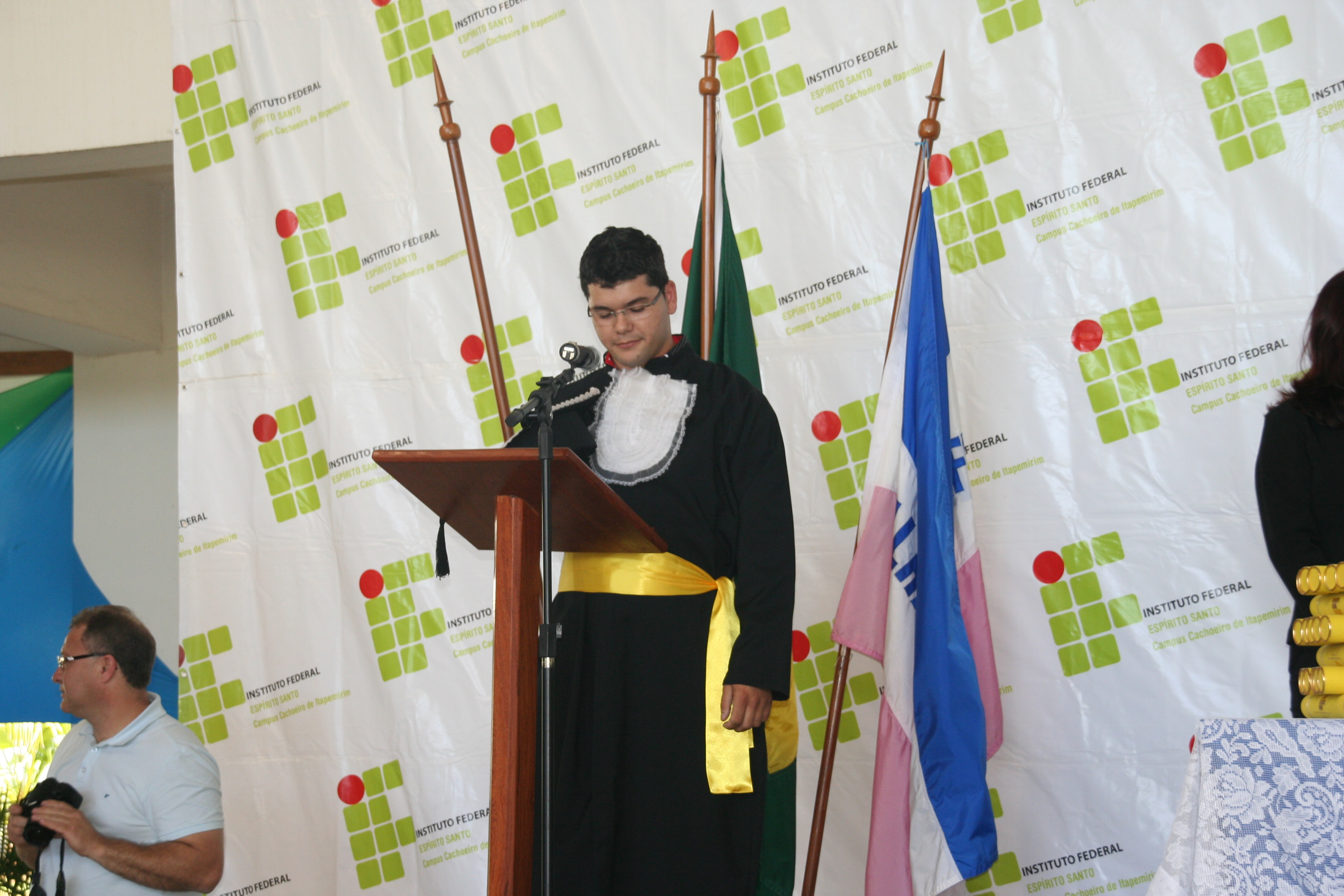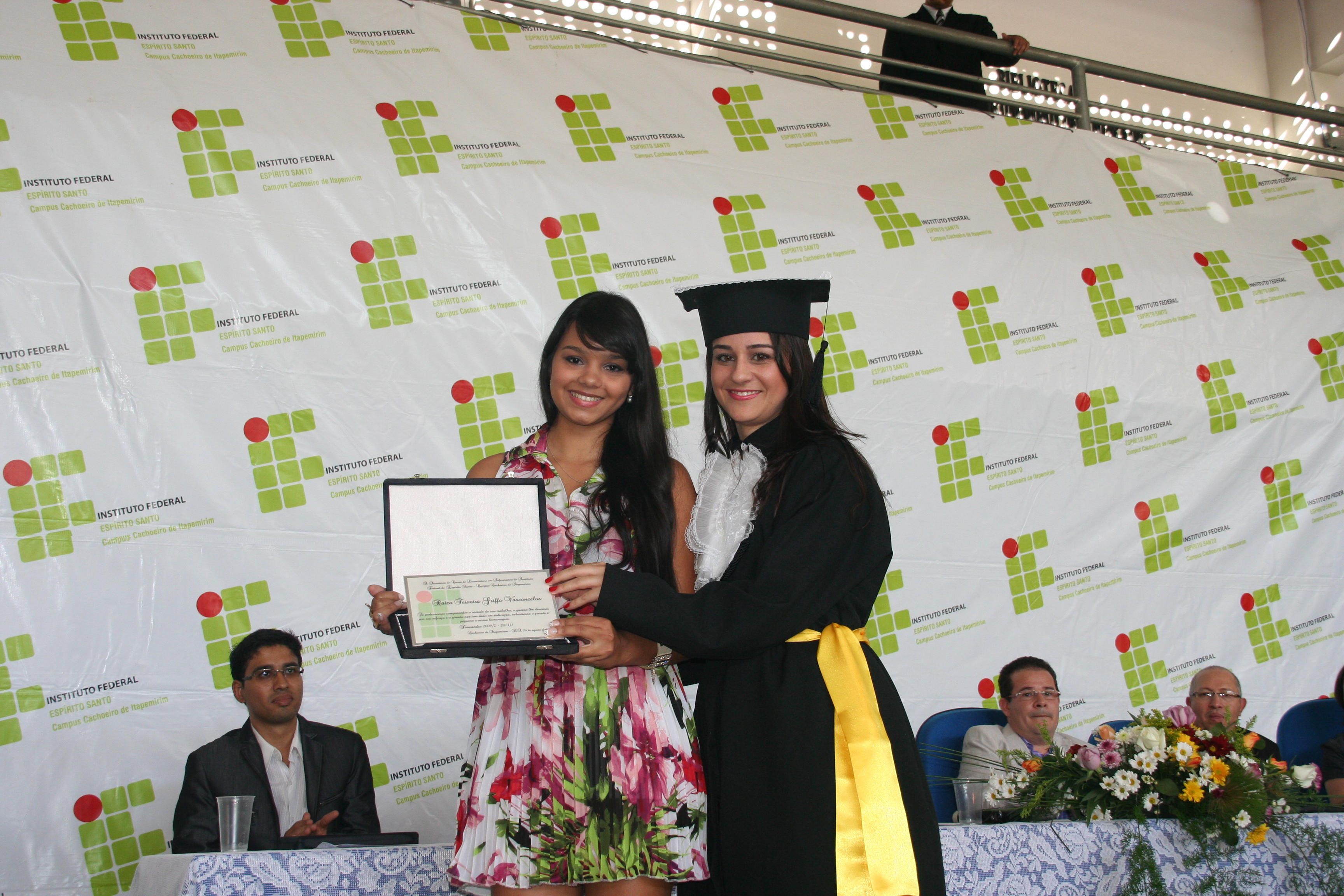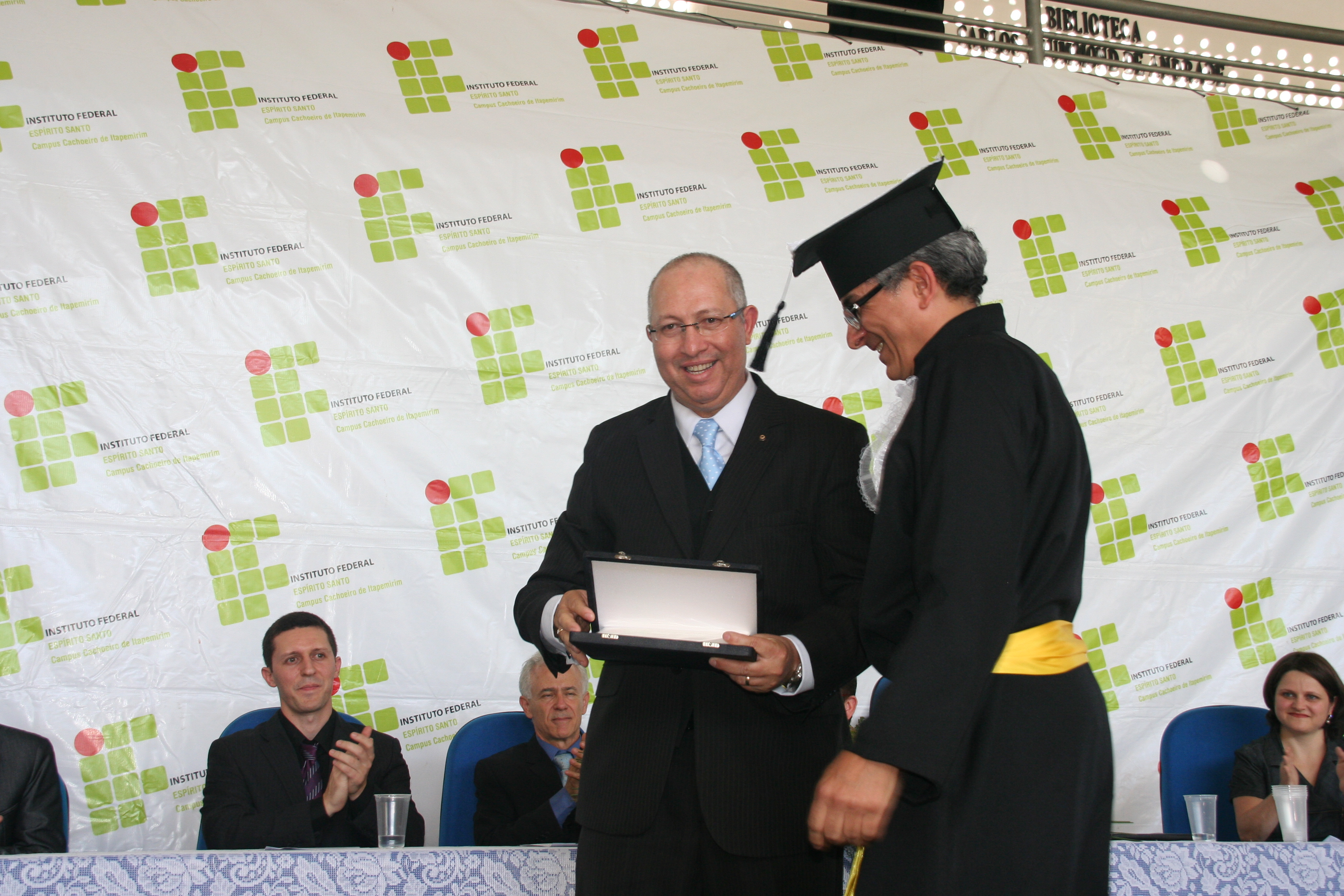 A mesa de honra foi constituída pelo reitor do Instituto Federal do Espírito Santo – Ifes, Denio Rebello Arantes; pelo professor Jorge Gualandi, representando o diretor-geral do campus Cachoeiro, Carlos Cezar Bettero; pela diretora de Educação a Distância do Ifes, Yvina Baldo; pelo coordenador do curso, Rafael Vargas Mesquita dos Santos; além do paraninfo Jocimar Fernandes e do patrono Ubiratan Roberte Cardoso Passos.