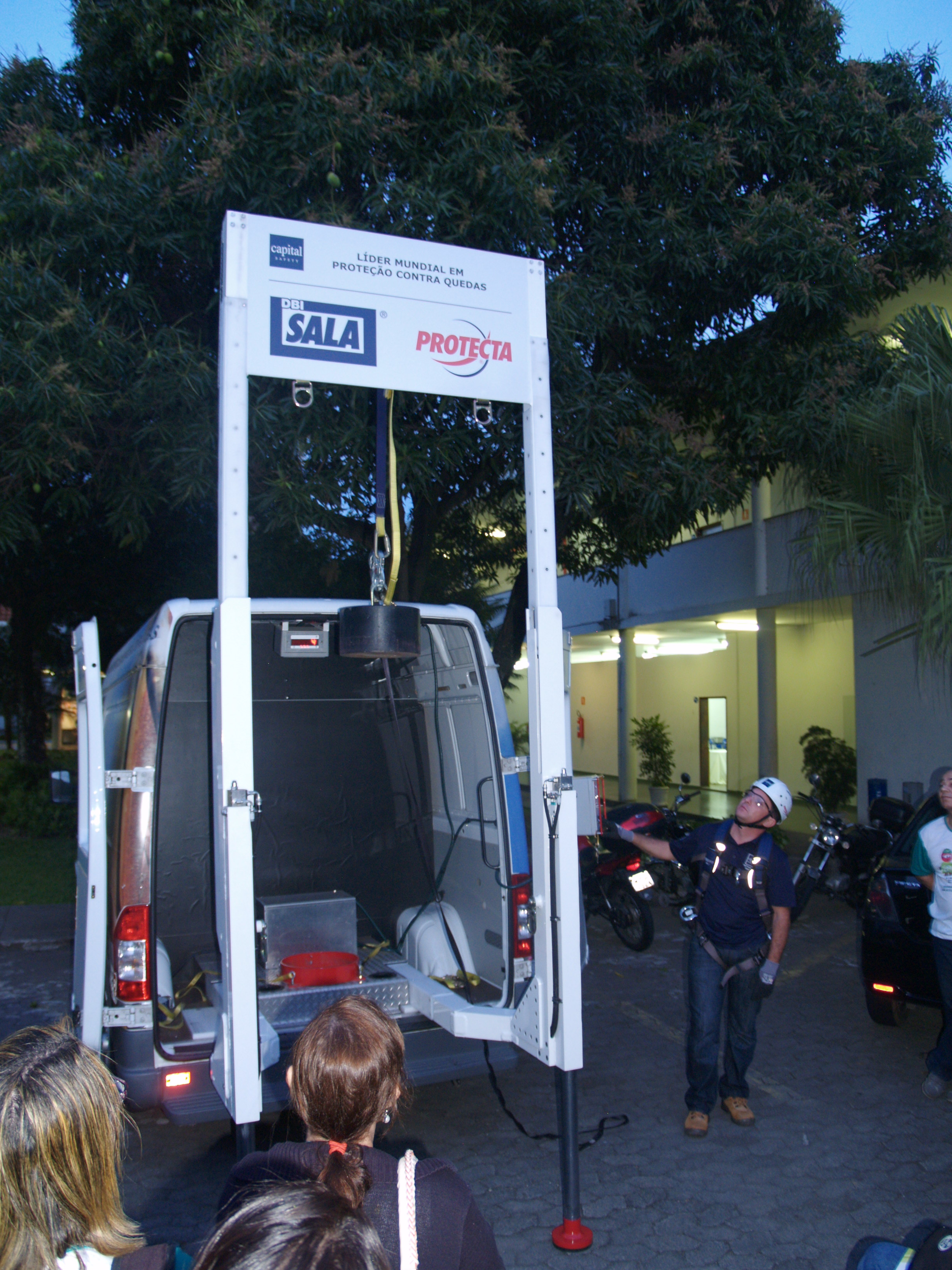 Ele ainda levou uma van especialmente preparada com um simulador de queda para mostrar, do lado de fora da sala de aula, a força e o impacto de quedas com diferentes dispositivos de segurança.