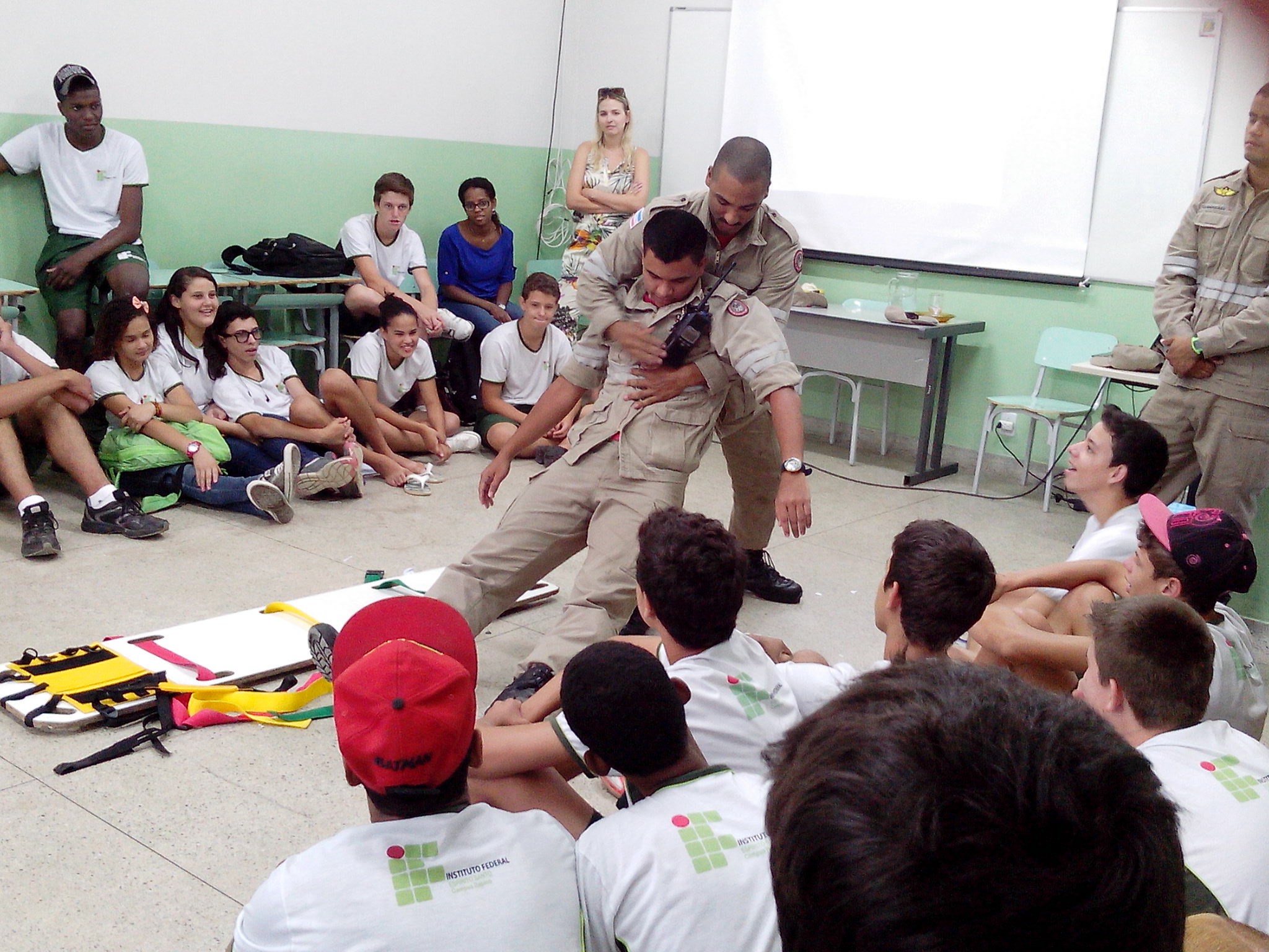 Os alunos do primeiro ano dos cursos técnicos integrados em Agropecuária e Zootecnia do campus Itapina tiveram a oportunidade de aprender, na prática, conhecimentos básicos sobre prevenção de acidentes e técnicas de primeiros socorros. Eles receberam a visita do Corpo de Bombeiros em um treinamento realizado como parte complementar da disciplina de Segurança, Meio Ambiente e Saúde.