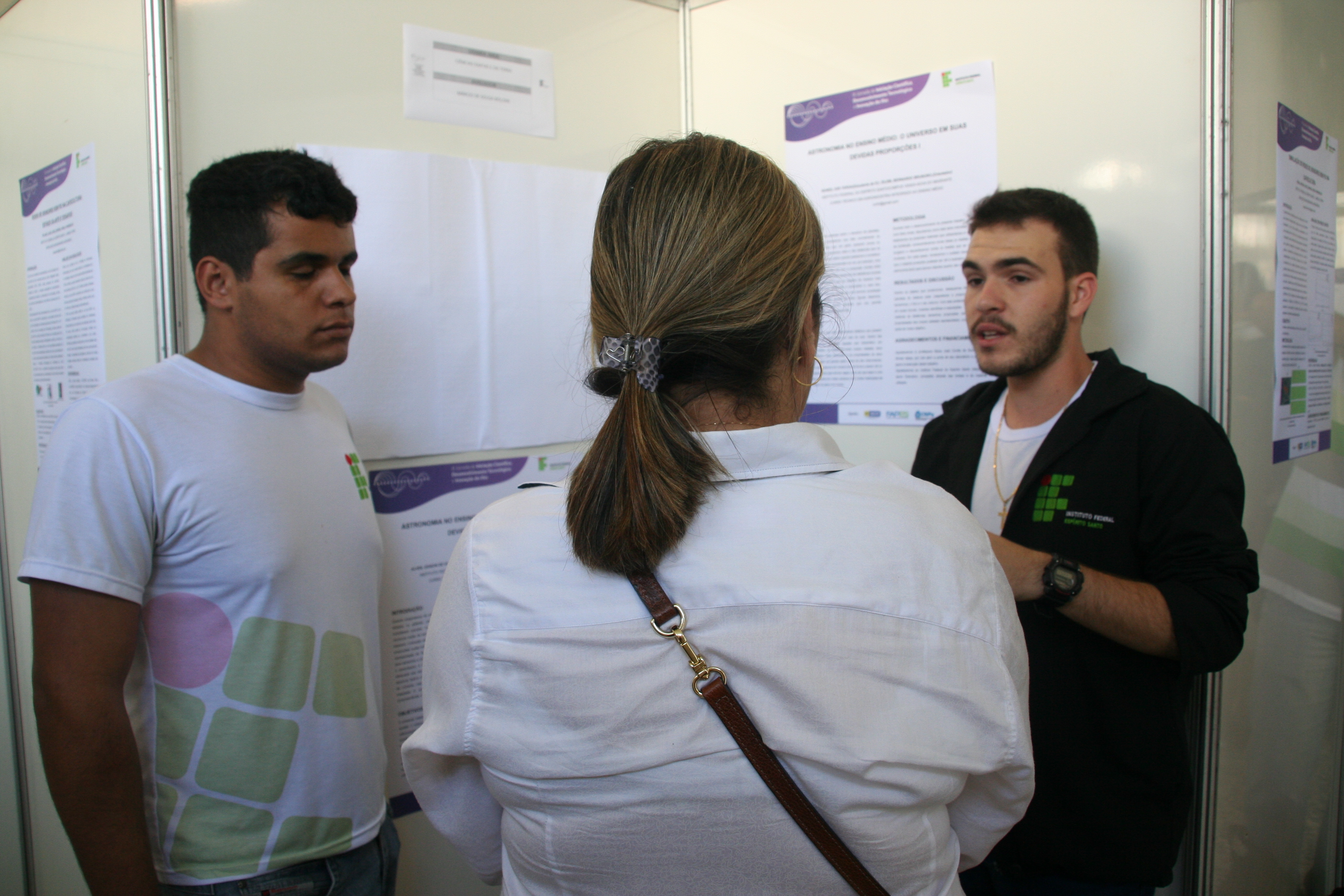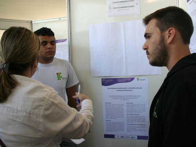 O trabalho “Astronomia no Ensino Médio: o Universo em Suas Devidas Proporções” foi dividido em duas partes, apresentadas em pôsteres diferentes. A pesquisa foi desenvolvida por Edison, do curso Técnico em Administração, junto com o colega Iuri Targa, do Técnico em Agroindústria, sob a orientação do professor Bernardo Brunoro Dilem.