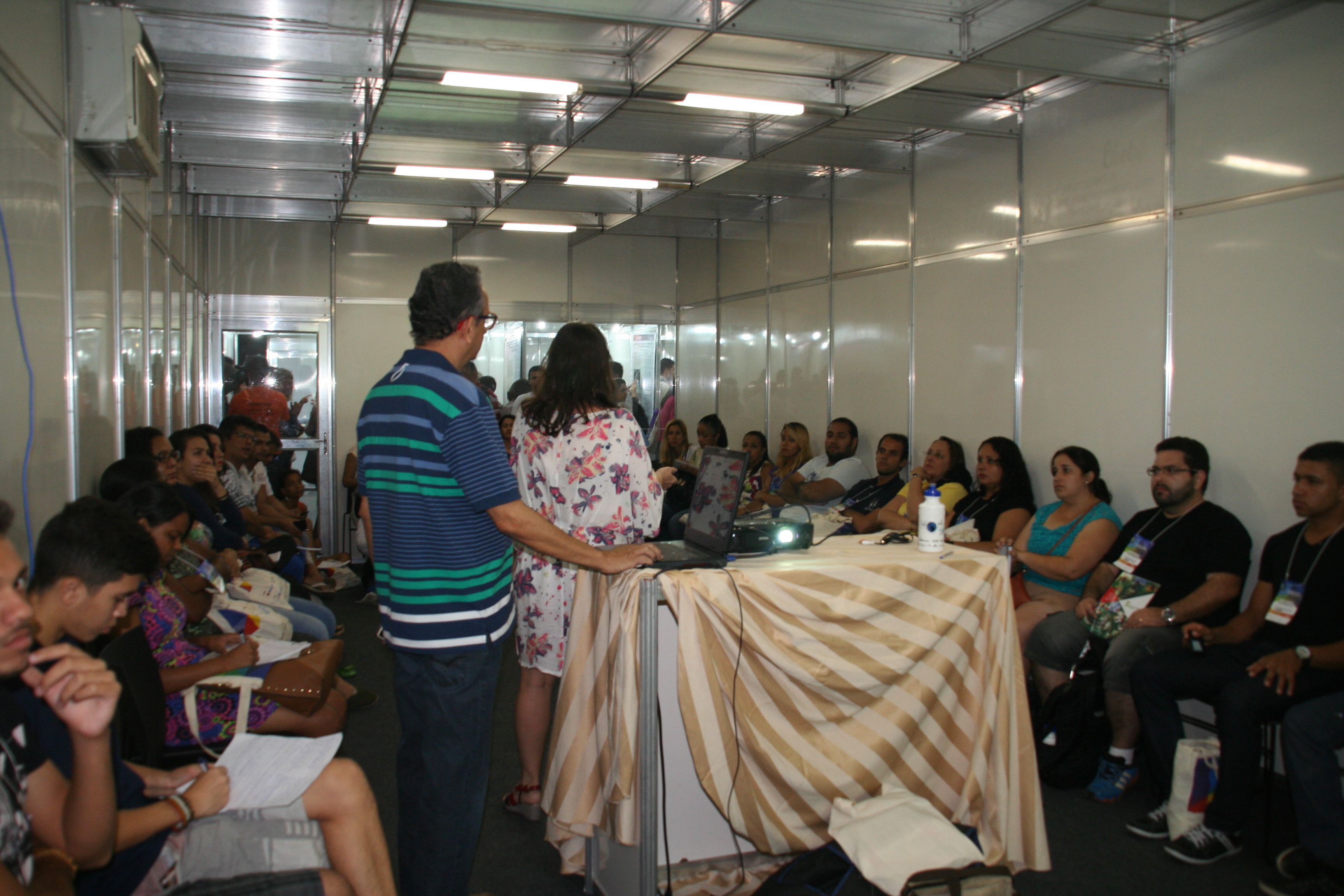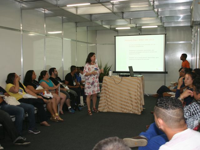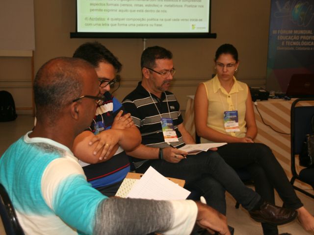 Na manhã da quinta-feira (28), os servidores Roberto Carlos Farias de Oliveira e Fernanda Souza da Silva do Campus Cachoeiro de Itapemirim, comandaram a oficina “Um olhar para a diversidade – oficina de produção literária” na sala Guaranhuns, com a participação de cerca de 15 pessoas. Os servidores apresentaram diversas produções literárias que trouxeram temas como machismo, preconceito, diversidade sexual e visões sobre a mulher. Esses temas foram amplamente discutidos e cada pessoa escreveu um texto – que poderia ser um conto, uma crônica, uma poesia ou um acróstico – sobre o tema. Em seguida as produções foram apresentadas para o grupo.