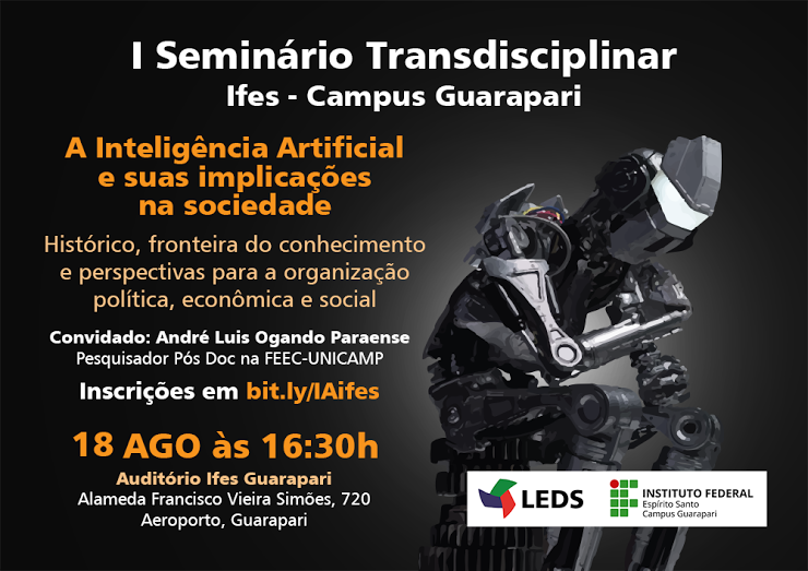 No dia 18 de agosto, o Campus Guarapari do Instituto Federal do Espírito Santo (Ifes) realiza o I Seminário Transdisciplinar com o tema “A Inteligência Artificial e suas implicações na sociedade: histórico, fronteira do conhecimento e perspectivas para a organização política, econômica e social”. O evento será no auditório da unidade, com início às 16h30.