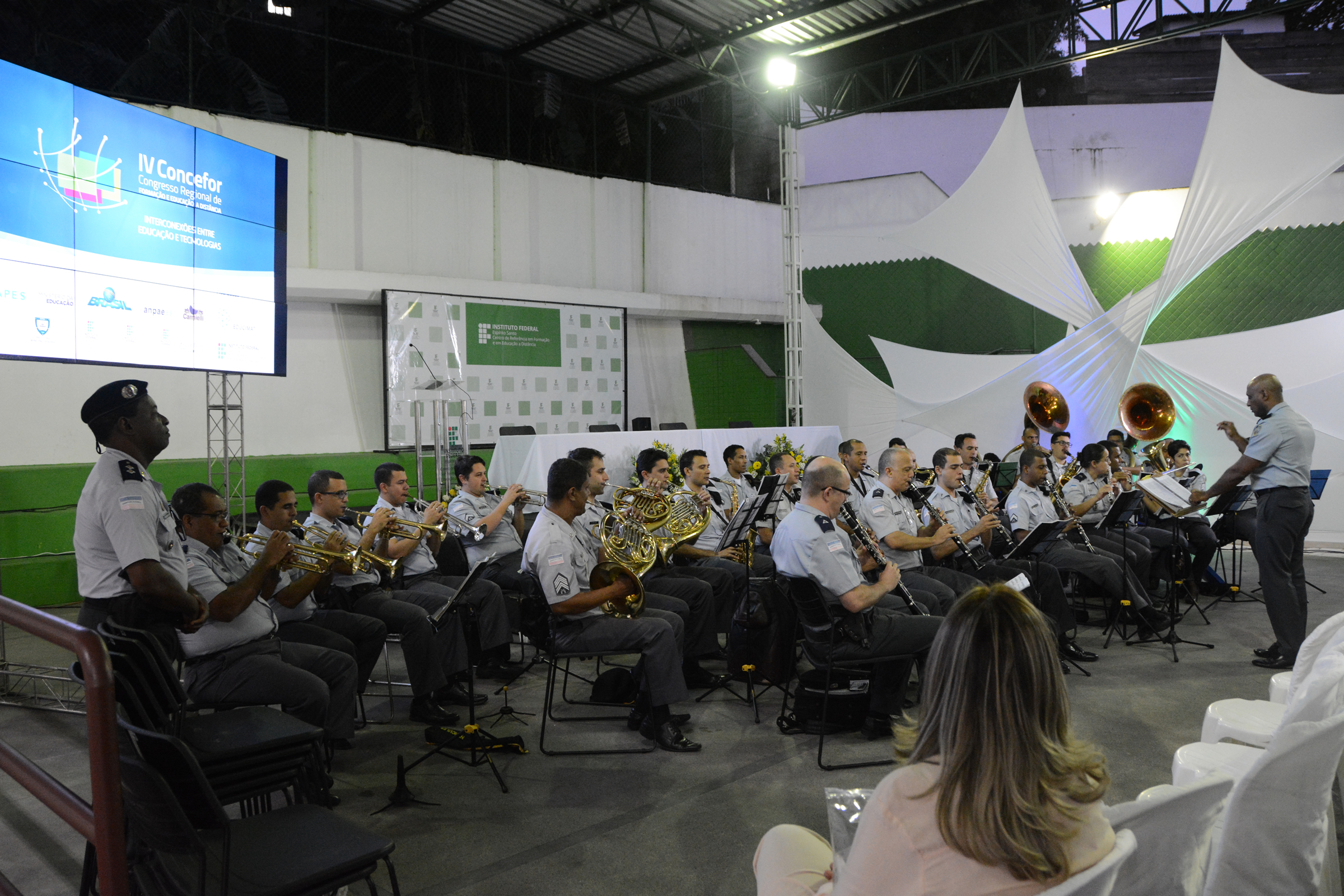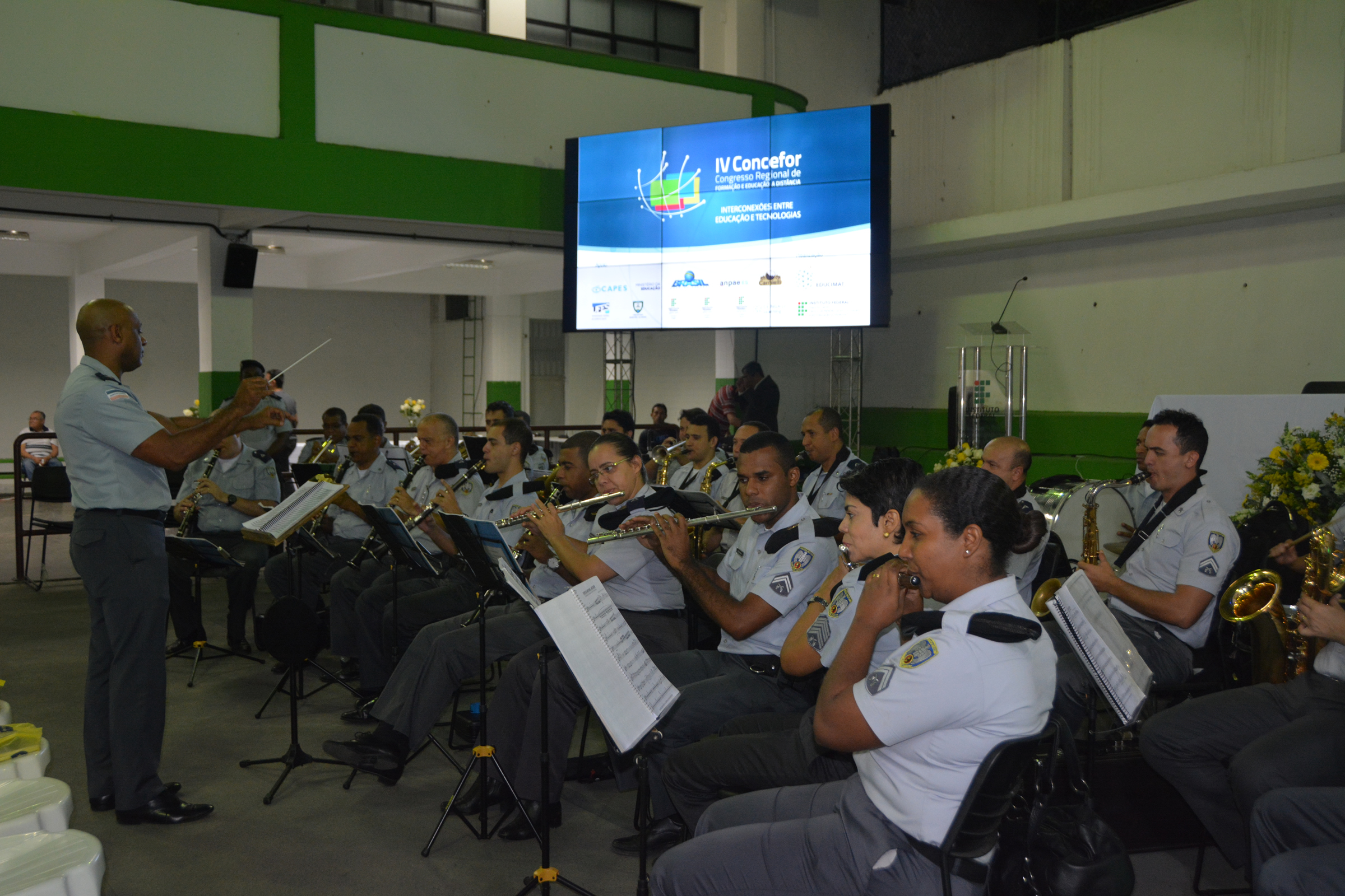 O Congresso Regional de Formação e Educação a Distância (Concefor) teve início nesta quinta-feira (10) com apresentação da Banda da Polícia Militar do Espírito Santo (PM-ES) e uma palestra sobre as “Interconexões entre Educação e Tecnologias na EAD”. Os participantes foram recebidos no Centro de Referência em Formação e em Educação a Distância (Cefor), do Ifes, a partir das 17h, quando puderam fazer o credenciamento.