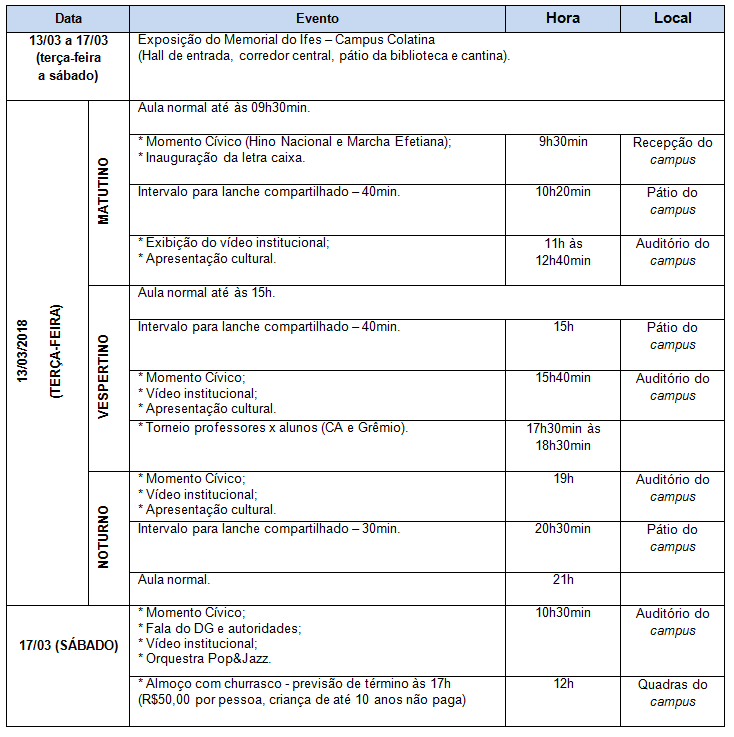 E para comemorar essa data tão importante, o campus preparou uma programação especial entre os dias 13 e 17 de março. Dentre as atividades, haverá apresentações culturais, exposição, música ao vivo e participação da Orquestra Pop & Jazz. Podem participar alunos, ex-alunos, servidores, ex-servidores e toda a comunidade.
